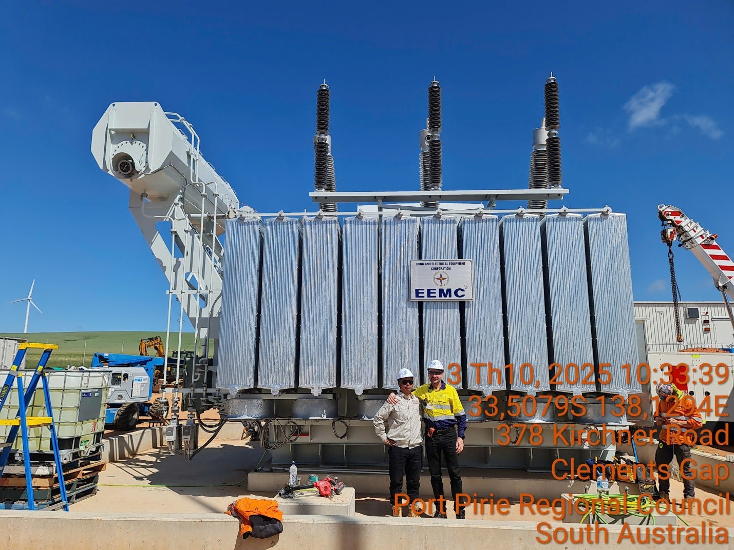 Kể từ ngày dời Cảng Hải Phòng tới Australia (ngày 19/8/2025), máy biến áp 70 MVA 132/33 kV do EEMC cung cấp đã được vận chuyển đến công trình dự án tại Clements Gap, South Australia (Nam Úc). Công tác lắp ráp máy biến áp được thực hiện từ ngày 26/09/2025 dưới sự hướng dẫn, giám sát chặt chẽ của kỹ sư EEMC cùng đối tác địa phương.